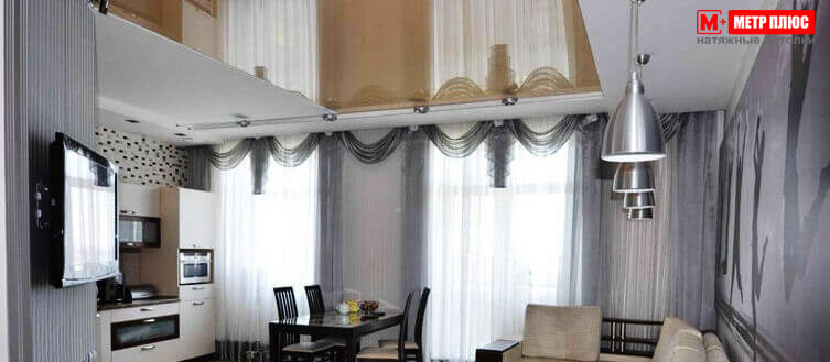 На данной фотографии отлично показана концепции зонирования пространства. Во-первых, это использования бежевой плёнки для места отдыха, а белый потолок для кухни. Обратите внимание на отличие напольного покрытия. Отличным смотрится размещением светильников над диваном. Учтите, при установке двухуровневых потолков лучше всего использовать как можно большее количество освещающих приборов, это выгодно в плане красоты помещения и с целью сэкономить на освещении комнаты.